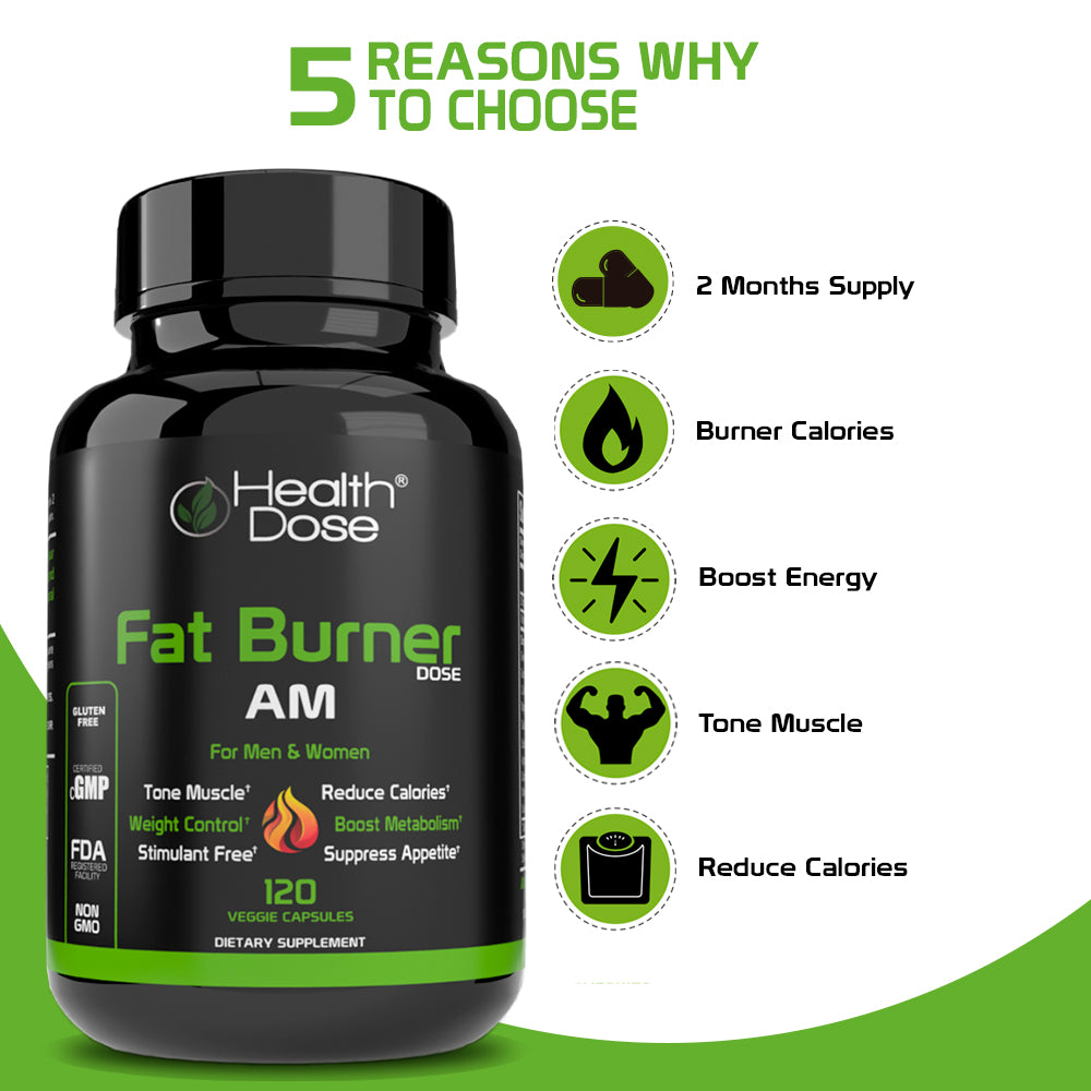 Health Dose Fat Burner AM Dietary Supplement. For Men and Women. Appetite Suppressor. Non-GMO, Gluten Free, Vegetarian Friendly