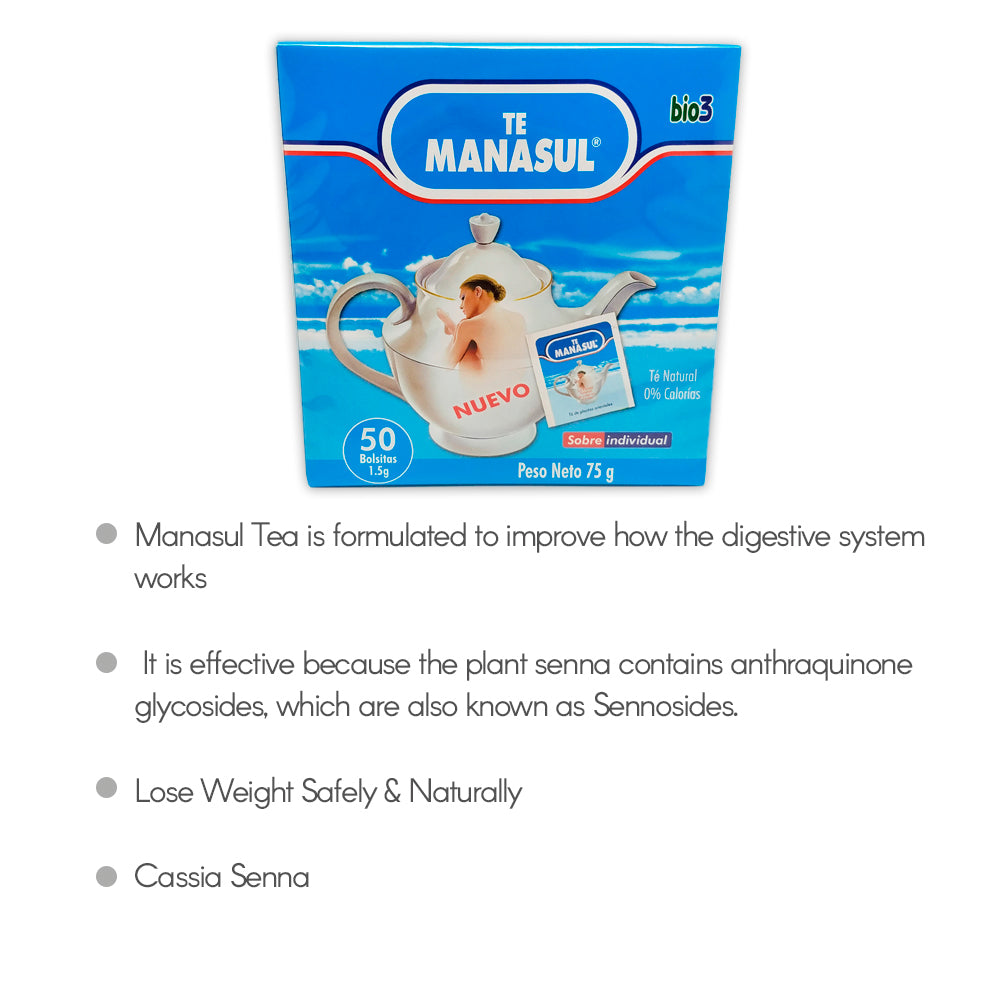 Manasul tea contains senna, which is a non bitter pod plant that is also named Cassia. Senna is a shrub from Pakistan, India and China. MANASUL is formulated to improve how your digestive system works. Manasul is effective because the plant Senna contains anthraquinone glycosides which is known as sennosides, the molecules are converted into rhein-anthrone by the normal bacteria in the colon. Manasul first action is to stimulate the colon activity by affecting the lining of the large intestine and thus speeds bowel movements. Second, this activity increases fluid secretion by the colon. All together these activities work to get a sluggish colon functional again.