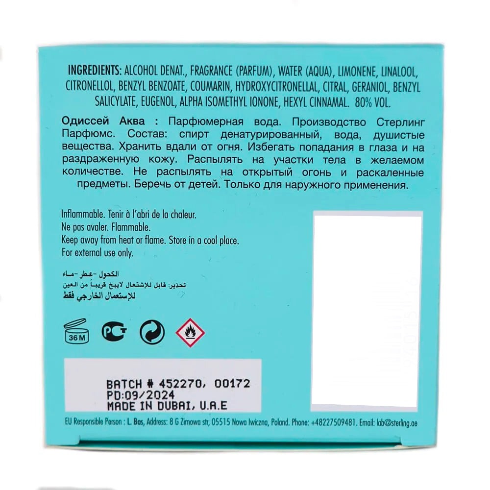 Armaf Odyssey Aqua Eau de Parfum for Men captures the essence of oceanic freshness and masculine sophistication. It opens with zesty citrus notes, leading to a heart of aromatic herbs and soft amber, finished by smooth musk and woody undertones. Ideal for daily wear, this invigorating scent radiates confidence, elegance, and lasting freshness. Perfect for the man who loves crisp, modern fragrances.